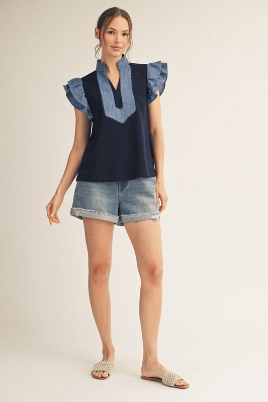 Denim Contrast Ruffle Sleeve Top
