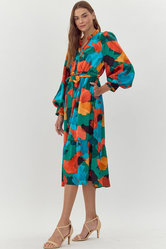 Abstract Print Bishop Sleeve Midi Dress (Green Mix)