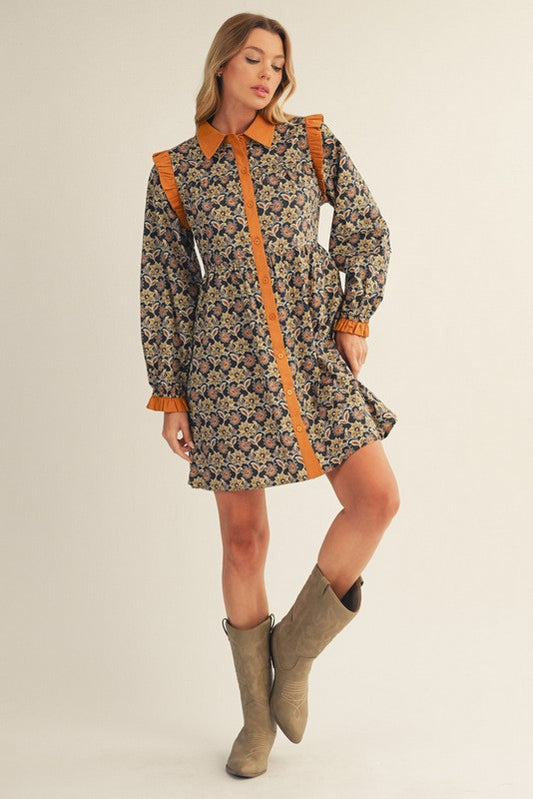 Floral Print Puff Sleeve Dress w/ Velvet Bow