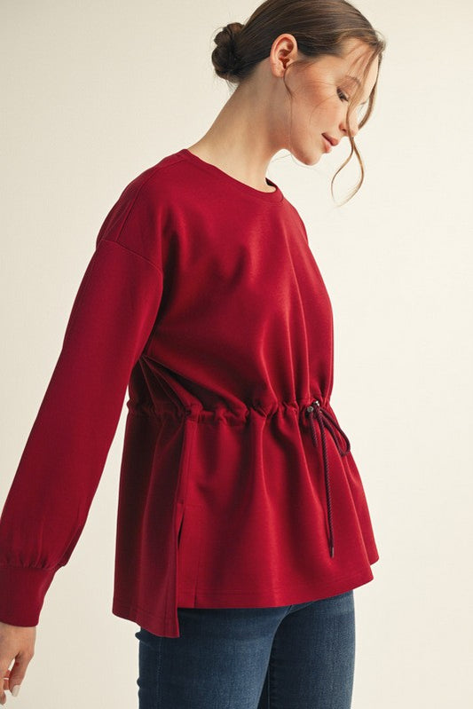 Long Sleeve Drawstring Waist Top (Burgundy)
