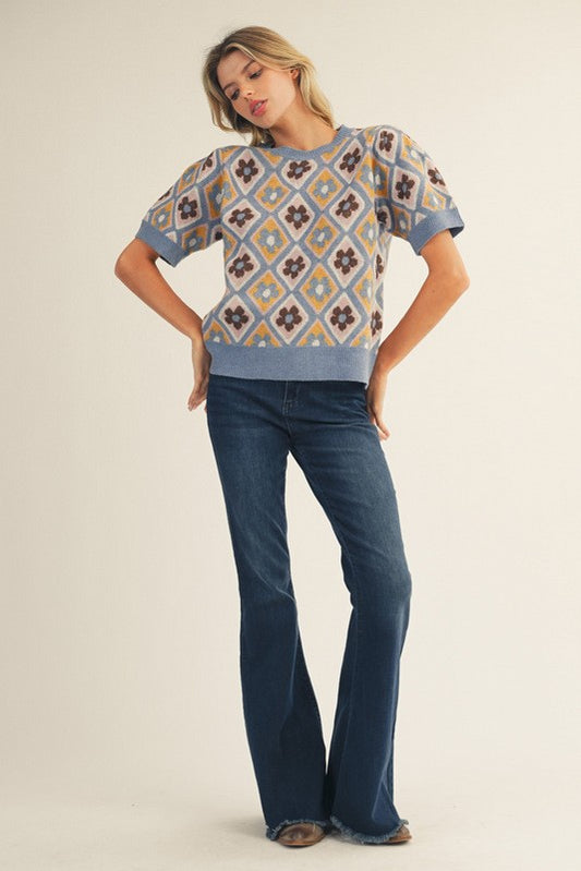 Checkered Heart Mock Neck Short Sleeve Sweater