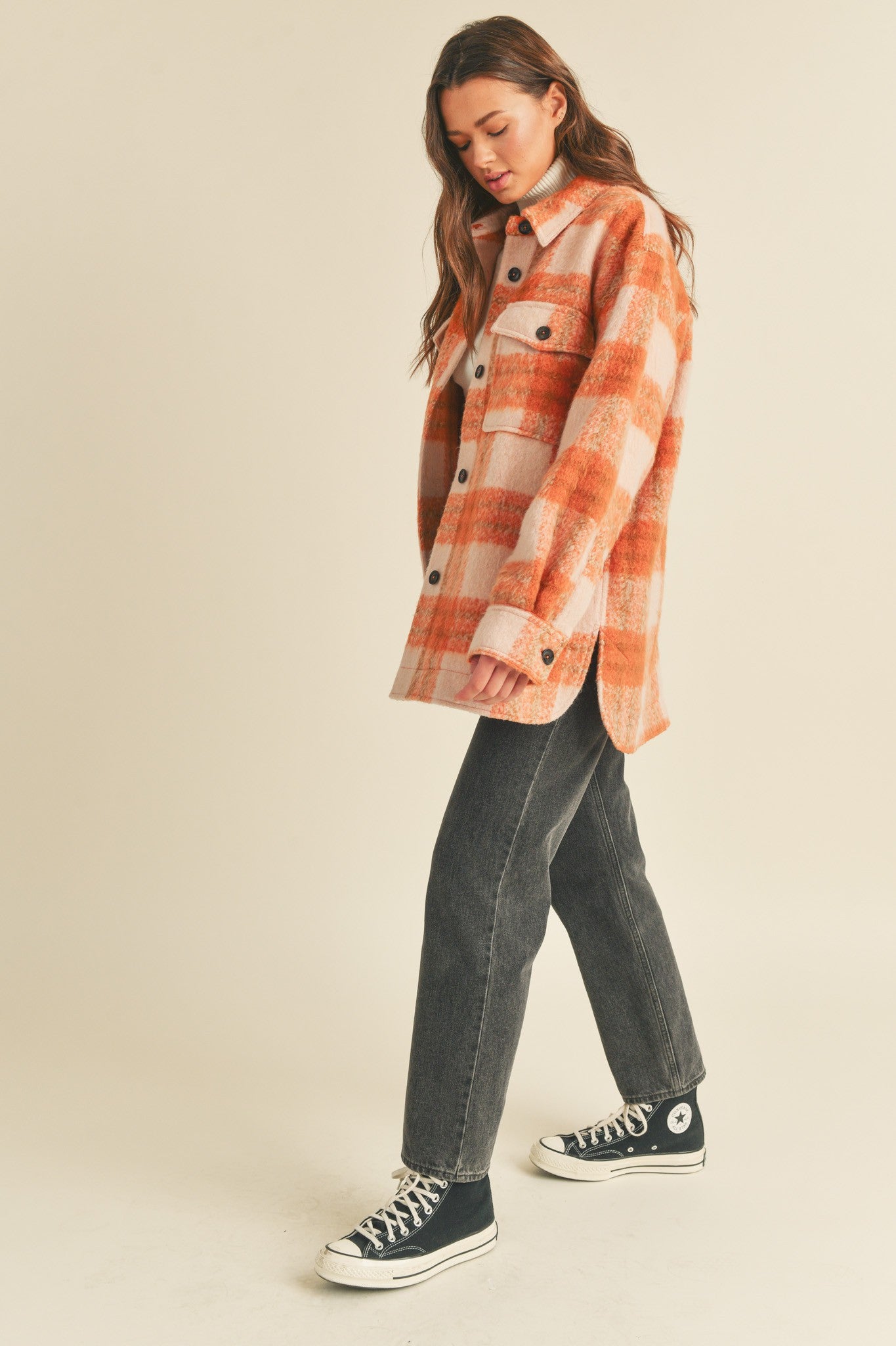 Layer up in style with this brushed plaid shacket that's giving all the cozy Fall vibes. The orange checkered pattern pairs perfectly with your autumn wardrobe, while the long sleeves and button front keep things classic and versatile. Practical chest and side pockets mean you've got room for all your essentials, making this trendy piece as functional as it is fashionable. Your new go-to for crisp mornings and casual adventures.