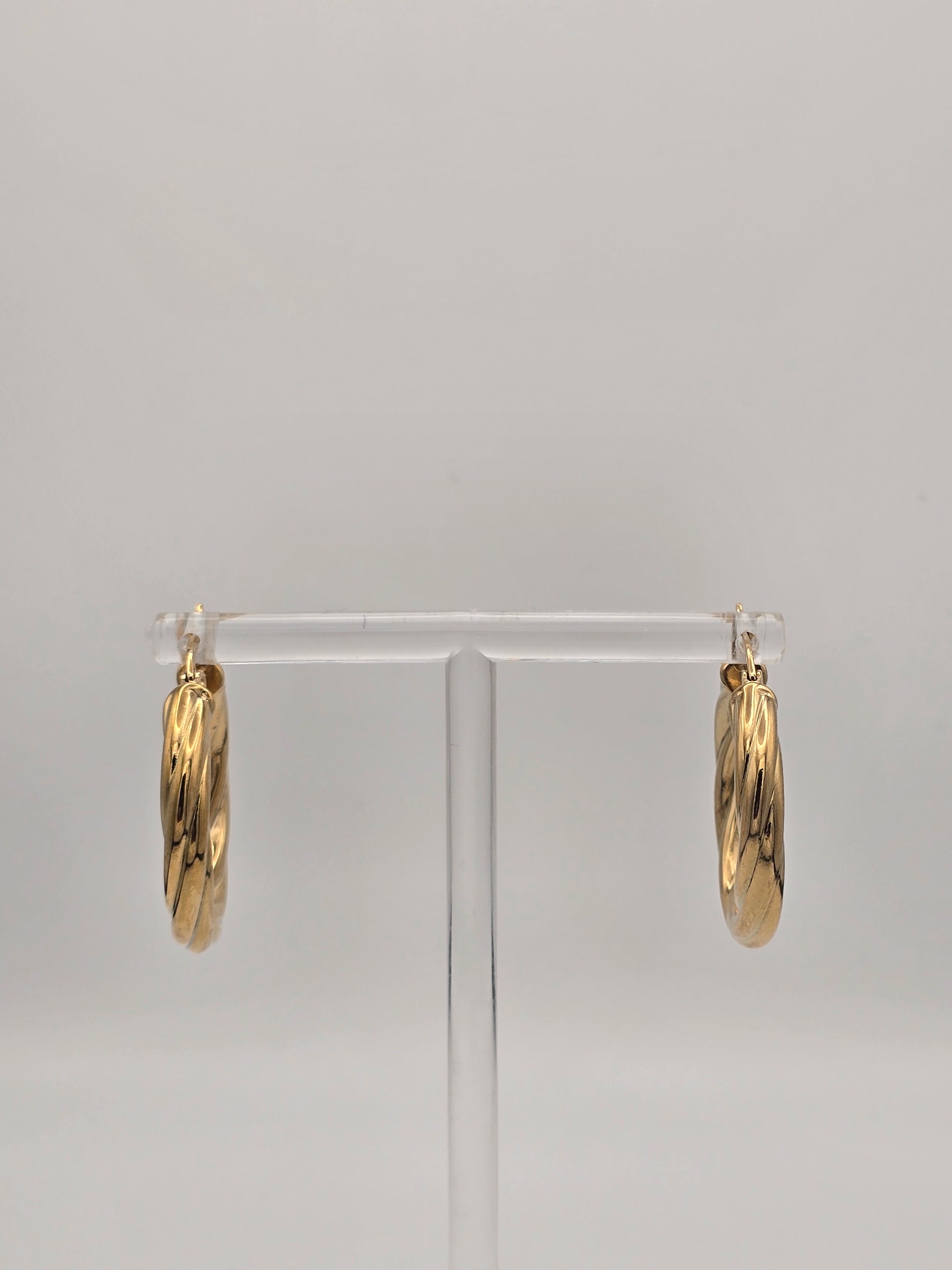 Elevate your ear game with these stunning stainless steel hoops that twist and shine! Crafted from durable stainless steel with a luxe gold plating, these medium-sized beauties feature a playful spiral design that catches the light from every angle. The secure hinged latch closure keeps them snug all day long, whether you're running errands or hitting the town. Versatile enough for everyday wear yet eye-catching enough to turn heads—these hoops are your new go-to accessory!